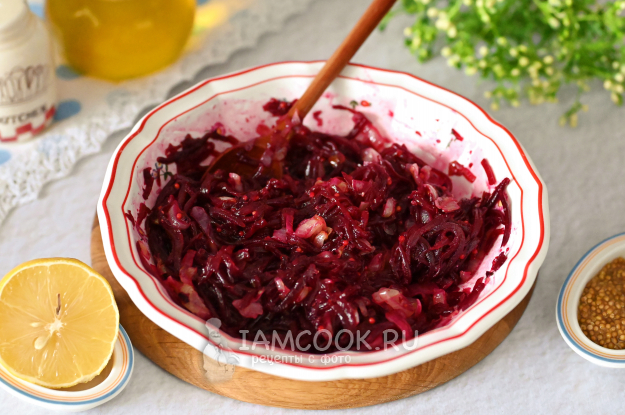 Добавьте к свекле соль, сахар, лимонный сок и дижонскую горчицу. Перемешайте, дайте постоять салату примерно 5-10 минут, чтобы соль и сахар растворились. Попробуйте и доведите до вкуса, если необходимо.
