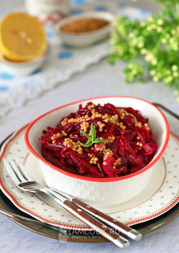 Подавать салат из свеклы с зернистой горчицей лучше через пару часов после приготовления, ему нужно настояться в холодильнике, тогда вкусы все подружатся и салат будет более насыщенным. Но если нет времени, то дегустируйте сразу.