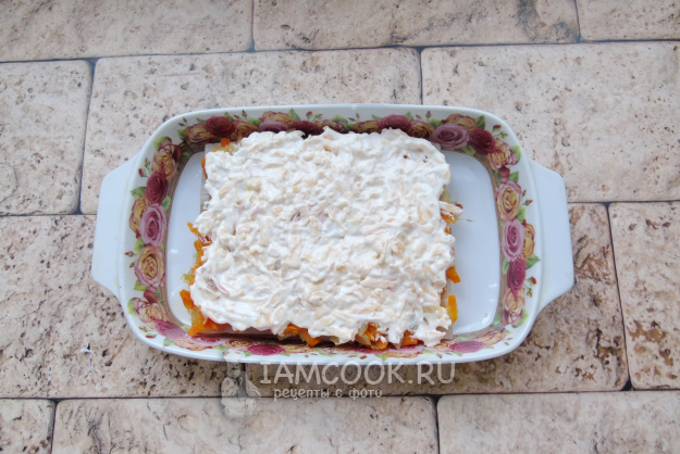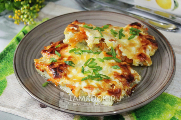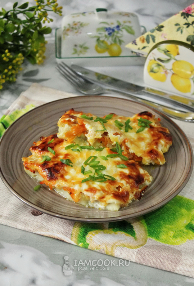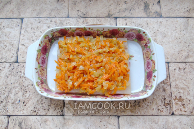 Филе камбалы в брикетах разморозьте, помойте и выложите в форму для запекания. Посолите и поперчите по вкусу. Накройте морковью и луком.