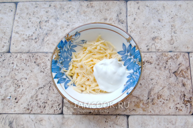 Твердый или полутвердый сыр натрите на терке и выложите в мисочку. Добавьте сметану.