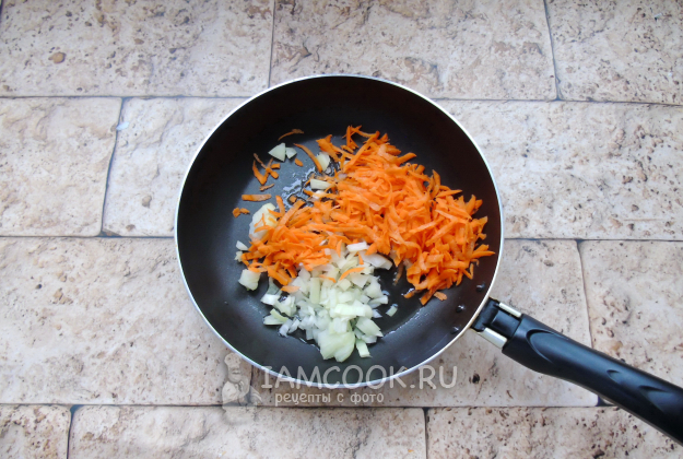 Морковь натрите на терке, а лук мелко нарежьте. Выложите в сковороду с растительным маслом.