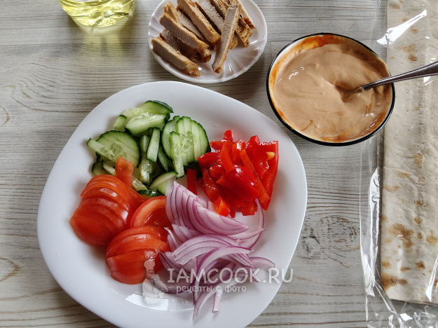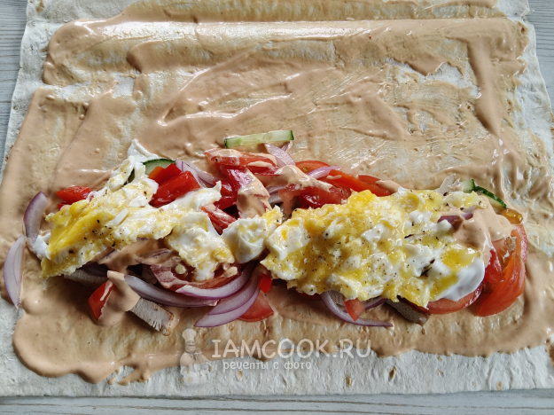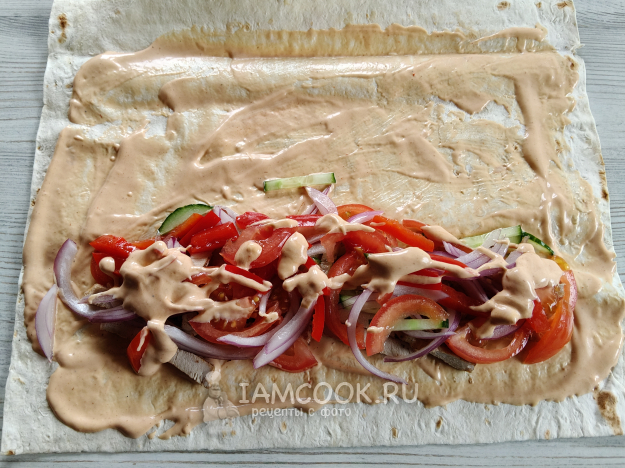 Лаваш смазать соусом, выложить овощи, полить соусом.