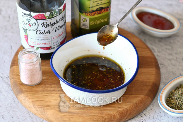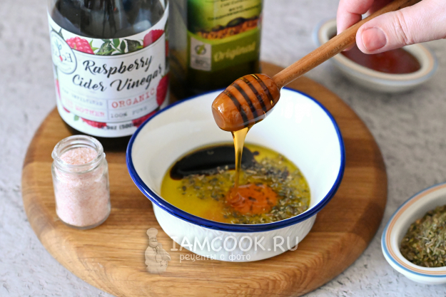 Для этого в мисочку налейте немного оливкового масла, капните пару чайных ложек малинового уксуса, добавьте по вкусу соль, прованские травы, и для сладости - немного темного меда.