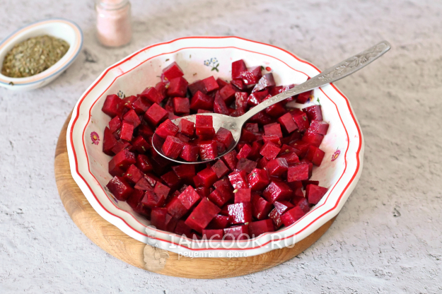 Ложкой тщательно перемешайте свеклу с маринадом, чтобы каждый кубик в нем искупался.