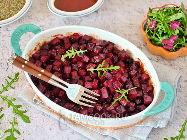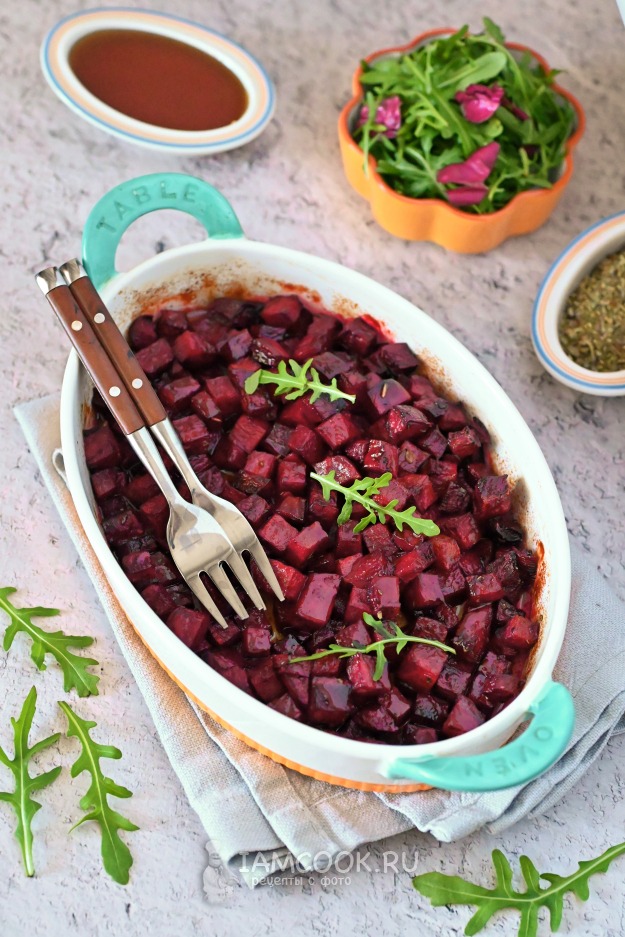Выложите замаринованные кубики свеклы в форму для запекания или на противень и отправьте в разогретую духовку. Запекайте свеклу до мягкости кубиков. Периодически можно доставать форму из духовки и перемешивать свеклу, так как с краев она печется быстрее, чем в середине.