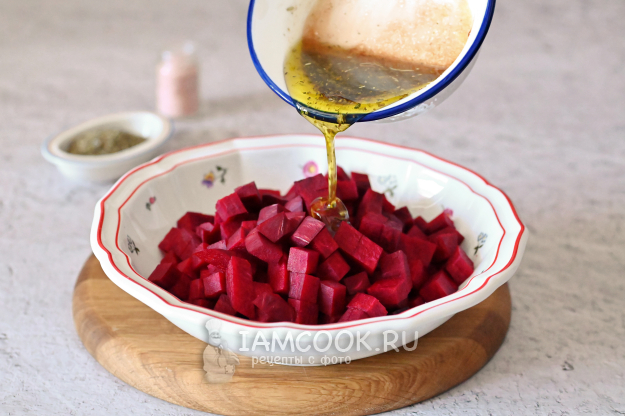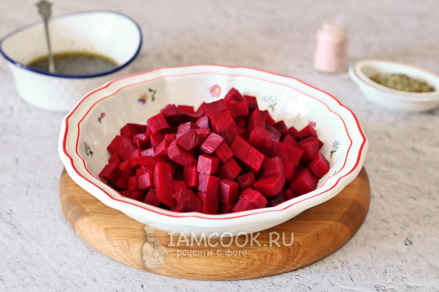 Кубики свеклы сложите в миску и полейте приготовленным ранее маринадом.