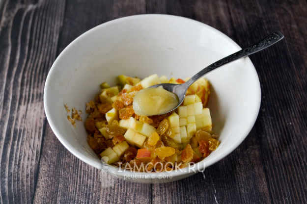 Положите промытый и распаренный изюм. Изюм можно залить вместе с хлопьями на ночь.