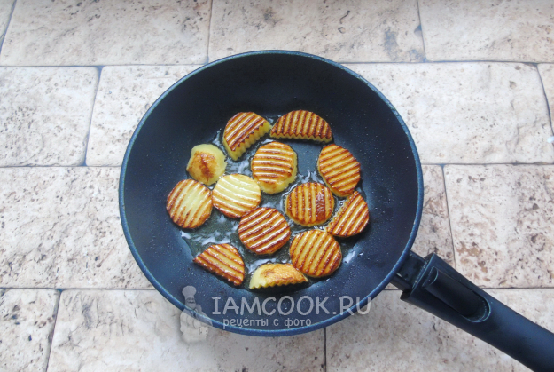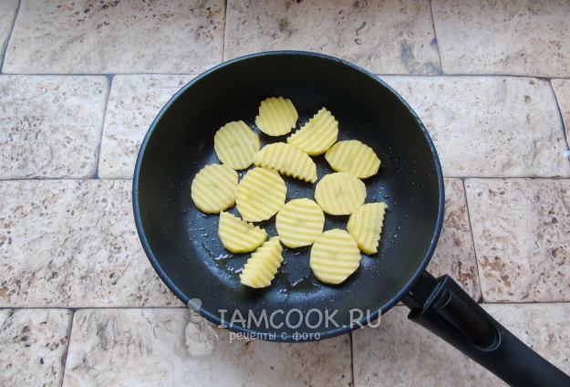 Картошку очистите, помойте и нарежьте кружками. Выложите на горячую сковороду с растительным маслом одним слоем.