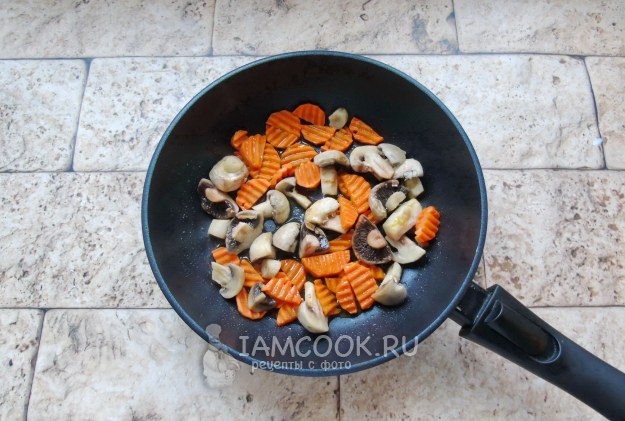 Морковь и грибы очистите, помойте и нарежьте произвольно. Выложите в сковороду с растительным маслом.