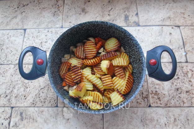 Морковь с грибами и картошку переложите в кастрюлю с антипригарным покрытием. Налейте 70-80 мл воды. Посолите, поперчите. Накройте кастрюлю крышкой и тушите овощи до готовности.