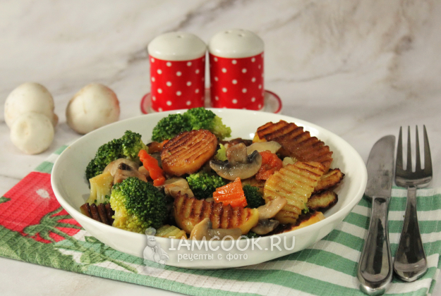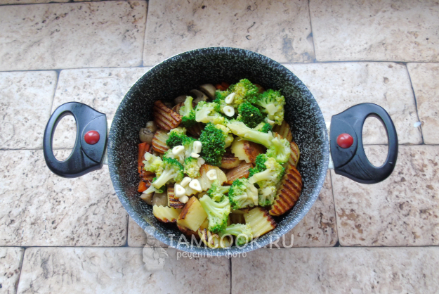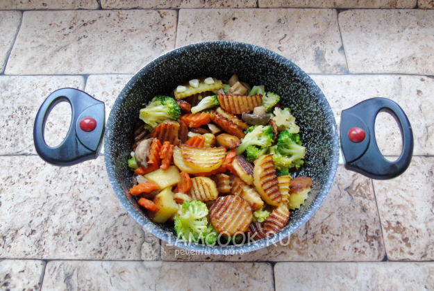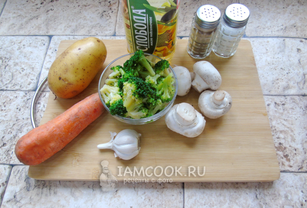 Соберите ингредиенты для приготовления жаркого с брокколи и грибами.