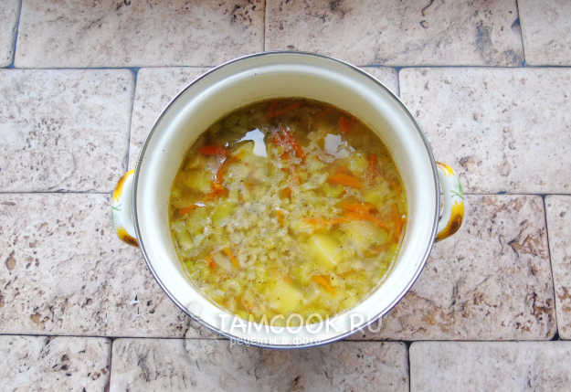 Залейте перловку бульоном или водой и варите почти до готовности, 25-30 минут.