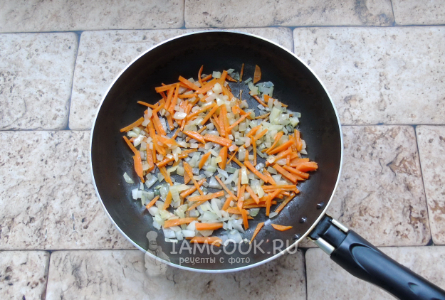 Тем временем морковь и репчатый лук нарежьте произвольно и выложите в сковороду с растительным маслом.