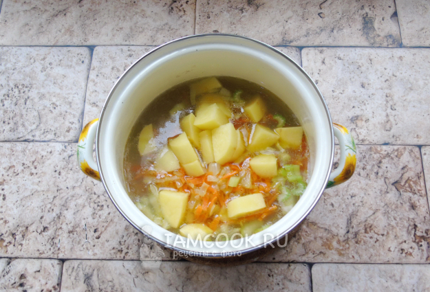 Картошку нарежьте и тоже добавьте в кастрюлю. Если нужно, налейте еще воду или бульон, ориентируясь на желаемую густоту супа.