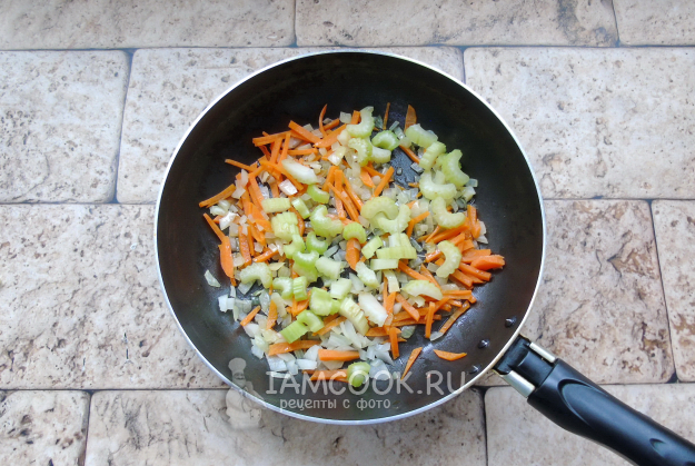 Затем добавьте нарезанный стебель сельдерея и пассеруйте еще несколько минут.