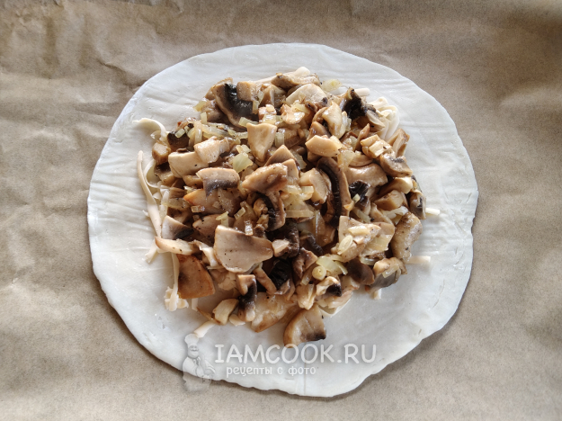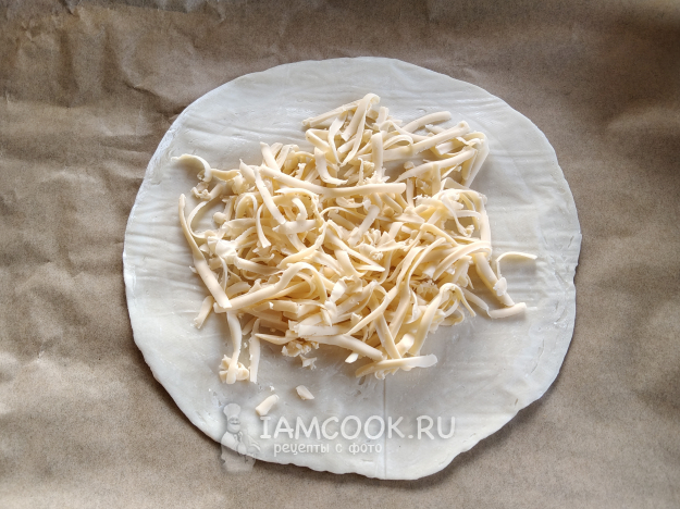 Лепешку положить на противень с пергаментом. В центр натереть на терке сыр.