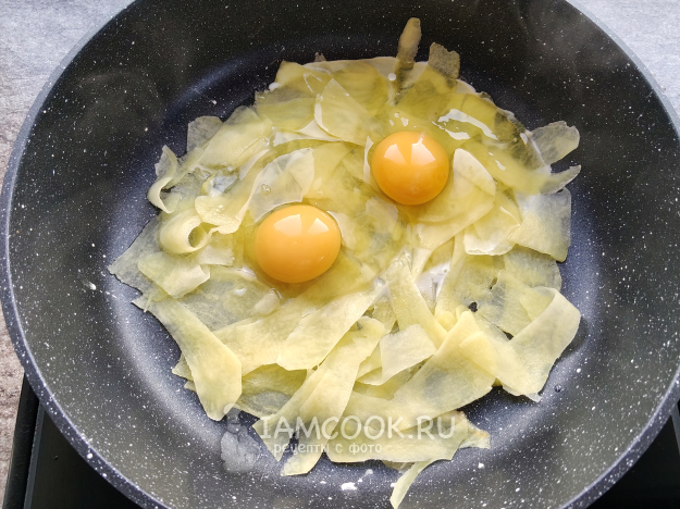 Разбить на картофель яйца.