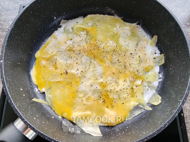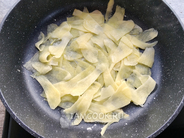 Сковороду сбрызнуть маслом. При помощи овощечистки нарезать картофель сразу в сковороду, тонким слоем, немного внахлест.