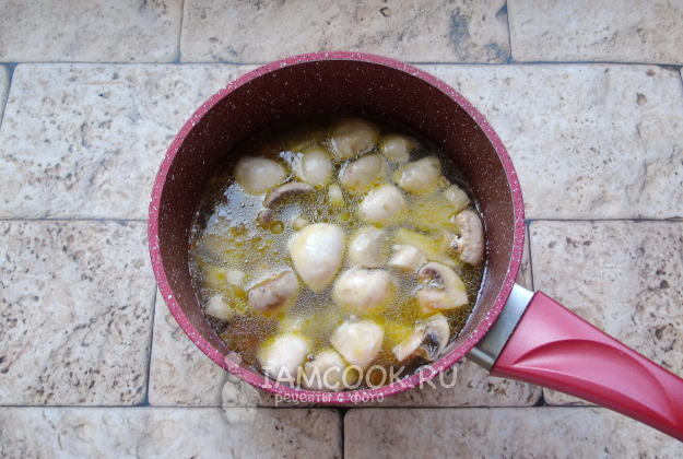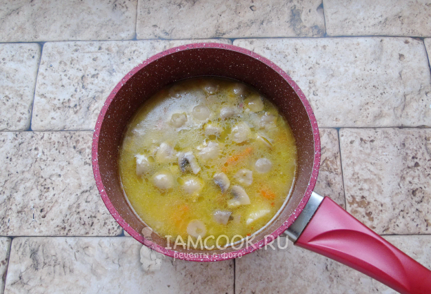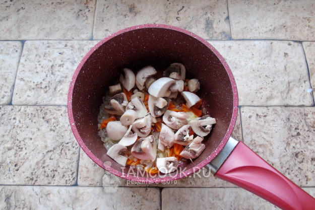 Шампиньоны очистите, помойте и нарежьте. Добавьте в кастрюлю.