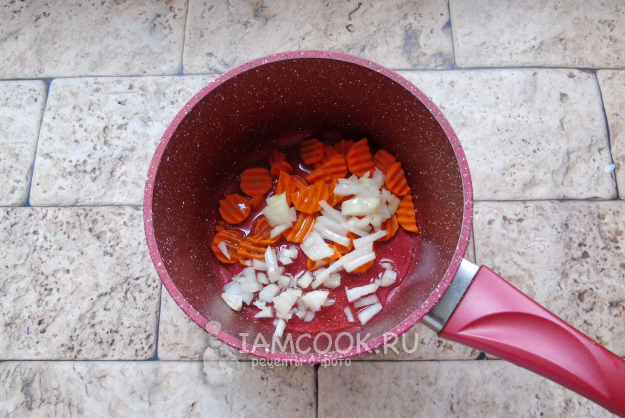 Морковь и репчатый лук очистите, помойте и нарежьте произвольно. Выложите в кастрюлю с толстым дном и налейте растительное масло.