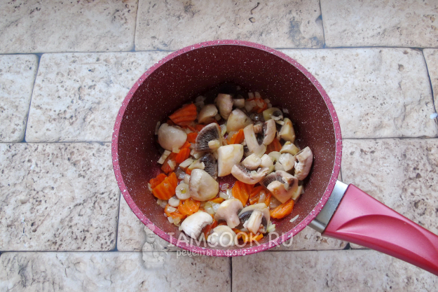 Жарьте грибы с луком и морковью еще 5-6 минут, перемешивая.