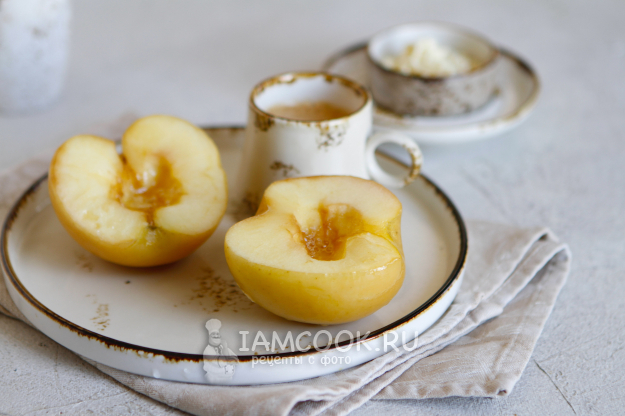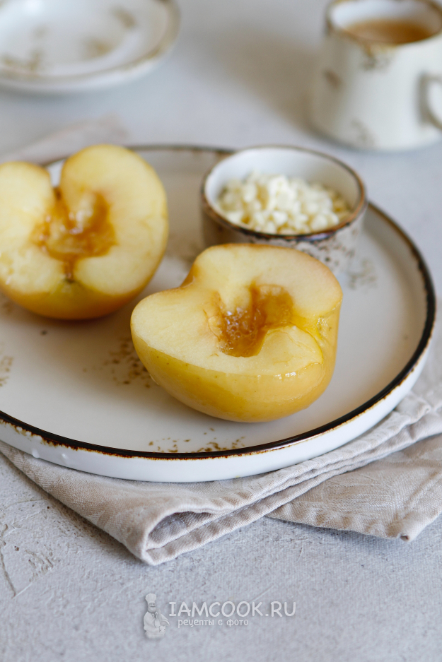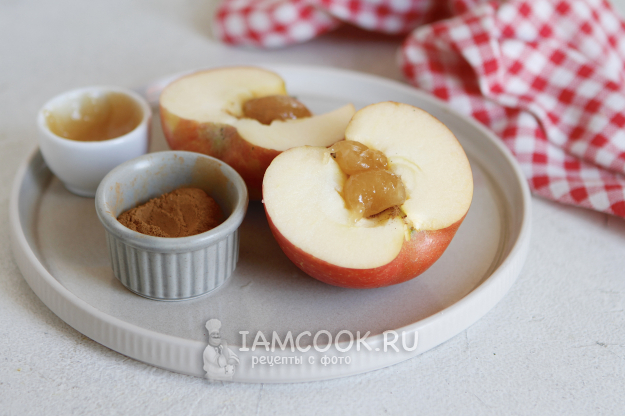 В две другие половинки яблок я положила немного корицы и мёда. Сюда еще можно добавить грецкие орехи или колотый миндаль.