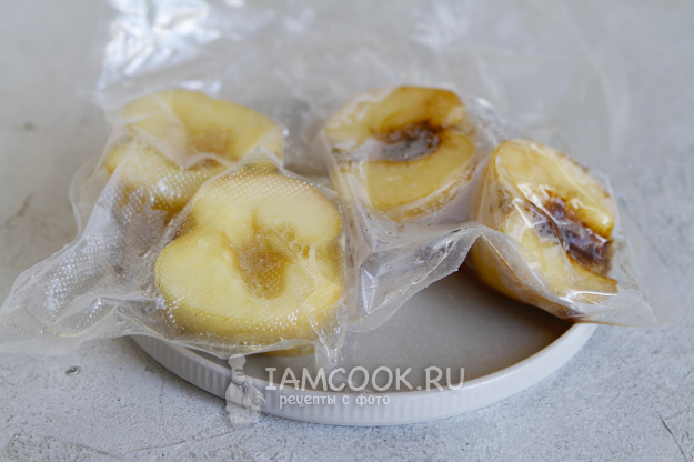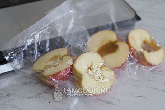 Аккуратно переложите половинки яблок в пакеты. Запечатайте пакеты при помощи вакуумного упаковщика, откачав лишний воздух.