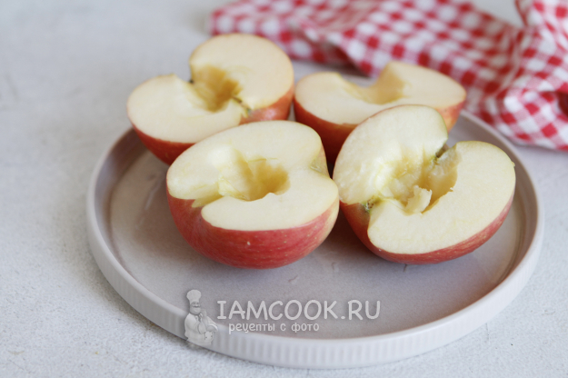 Яблоко помойте под проточной водой. Разрежьте пополам, удалите сердцевину и семена. Если яблоки небольшие по размеру, то лучше готовить их целиком. В таком случае удалите плодоножку и при помощи ножа сделайте ямку. Если не планируете добавлять никакие дополнения, то оставляйте яблоки как есть.