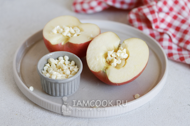 Что касается дополнений, то выбирайте их на свой вкус. Можно каждую половину яблока сбрызнуть лимонным соком и присыпать сахаром. Две половинки яблок я заполнила белым шоколадом, он у меня в каплях.