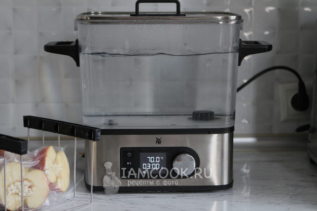 Если у вашей мультиварки есть режим «Сувид», то смело готовьте яблоки в ней. Я готовила в пароварке-сувиднице. Заполните контейнер или чашу мультиварки водой и выставьте температуру 70 градусов.