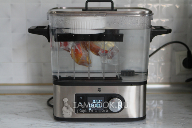 Когда вода нагреется до нужной температуры, опустите пакеты с яблоками и готовьте 3 часа. Важно: яблоки должны быть полностью погружены в воду. Если пакеты будут всплывать, можно установить небольшой грузик.