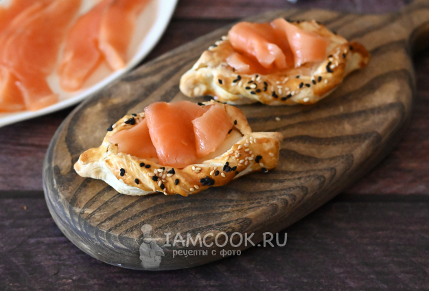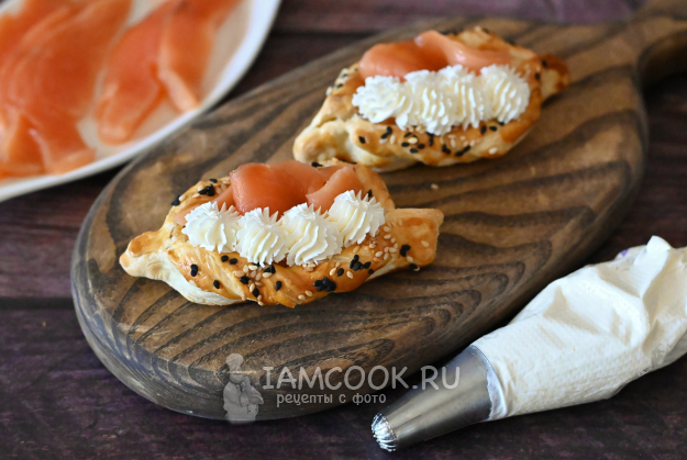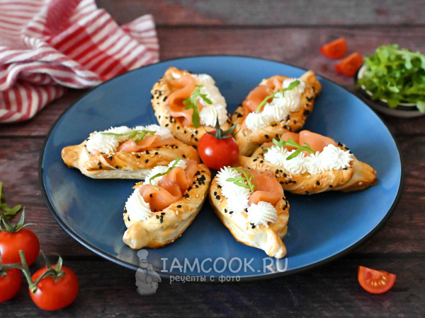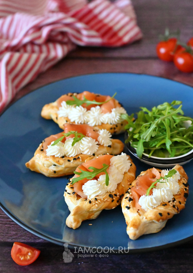 Лодочки из слоеного теста с красной рыбой готовы. Их можно по желанию украсить листиком зелени.