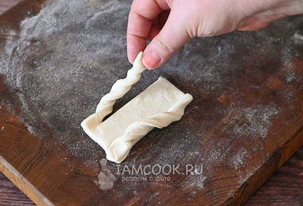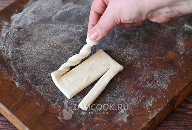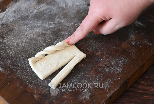 Возьмите один хвостик теста, скрутите его спиралью.