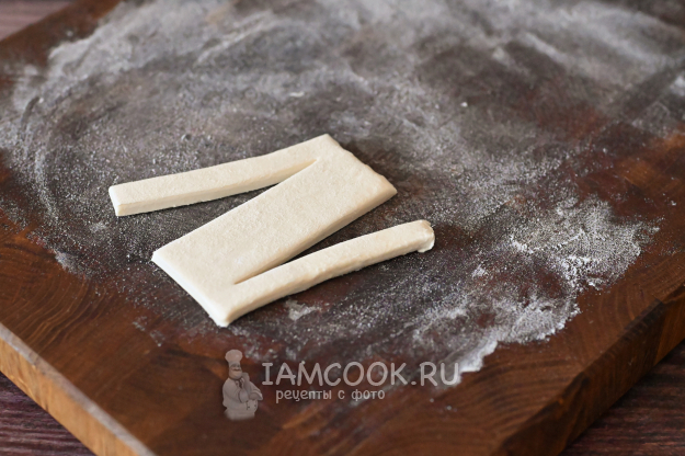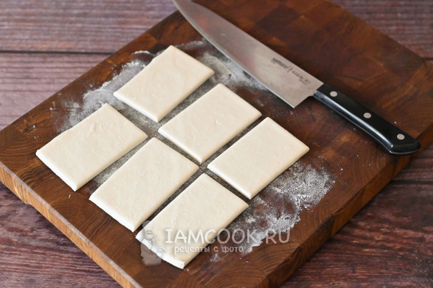 Разрежьте пласт теста на 6 прямоугольных кусочков.