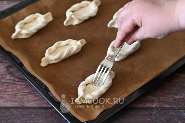 Переложите их на противень, застеленный пергаментом или ковриком для выпечки. Вилкой наколите дно лодочки, чтобы оно сильно не поднялось при выпечке.