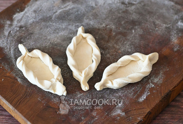 А затем соедините края теста, формируя лодочку, хорошенько прижимая пальцами, чтобы при выпечке лодочки не потеряли форму.