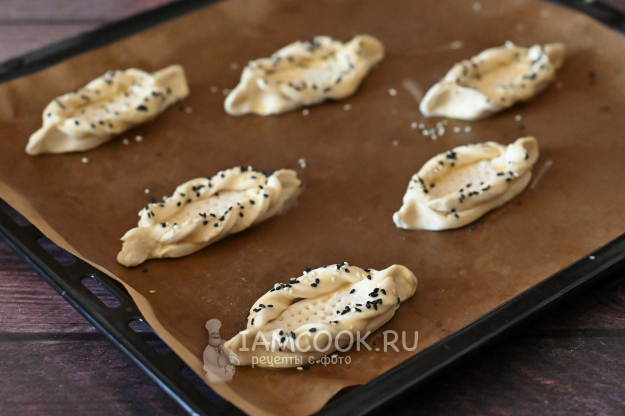 Бортики лодочек смажьте взбитым яйцом и присыпьте кунжутом.