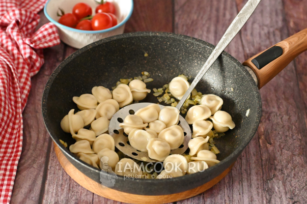 Готовые пельмени шумовкой достаньте из кастрюли и переложите в сковороду к луку.