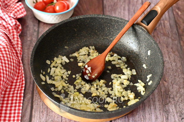 Пока варятся пельмени, на соседнюю конфорку поставьте сковороду, налейте в неё оливковое масло и добавьте нарезанный мелко лук. Обжарьте его до золотистого цвета, периодически помешивая.
