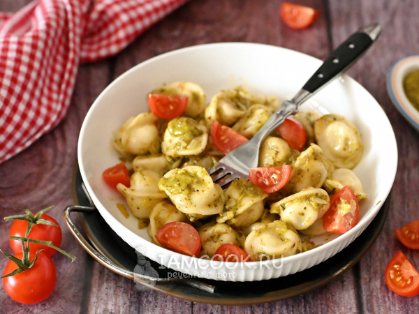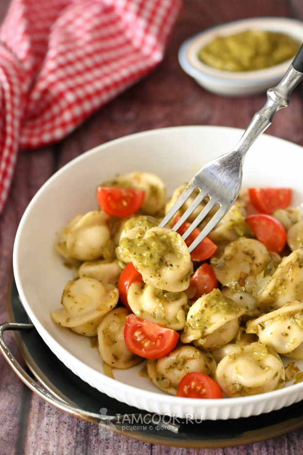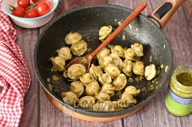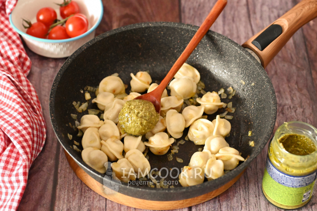 Снимите сковороду с огня и добавьте к пельменям столовую ложку соуса песто.