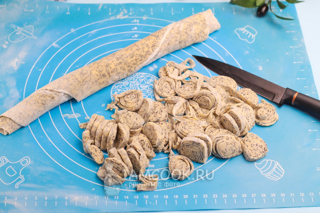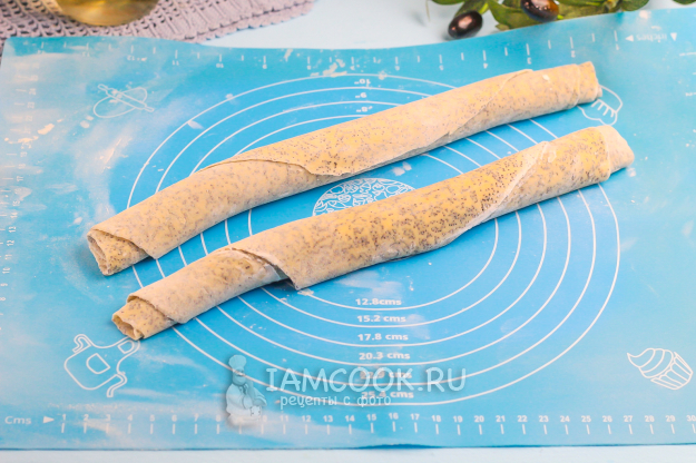 Аккуратно скрутите раскатанный пласт в рулет, не сильно прижимая. Таким же образом раскатайте оставшуюся часть теста и сформируйте рулет.