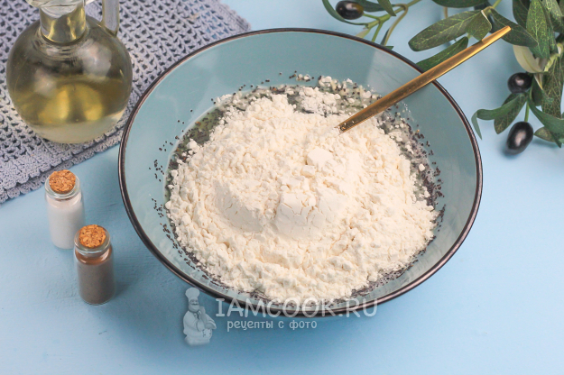 Понемногу добавляйте муку, замешивая тесто сначала вилкой. После чего пересыпьте муку на рабочую поверхность или силиконовый коврик и выложите на нее тесто.