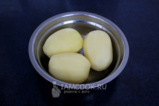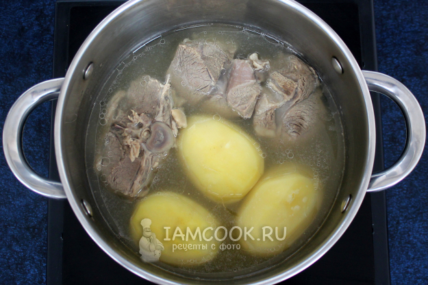 Через час или немного дольше отправьте в бульон с бараниной три целые крупные картофелины и лавровый лист. После закипания посолите.