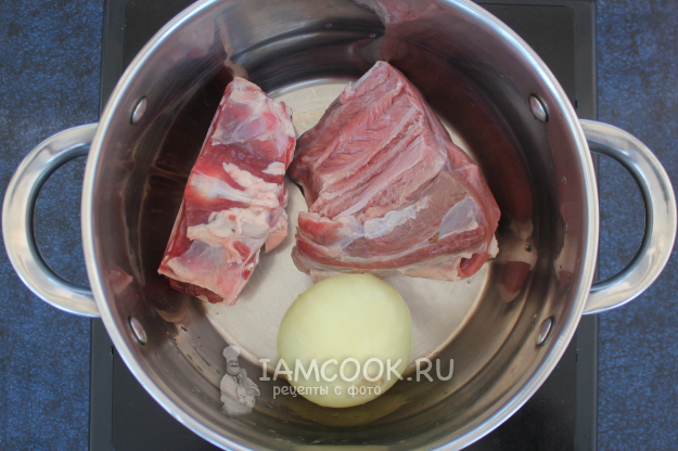 Для бульона залейте водой подготовленные куски баранины и целую луковицу. Доведите до кипения и снимите накипь. Убавьте огонь до слабого, добавьте чёрный перец. Варите в течение часа. Для прозрачного бульона варят без крышки, но тут решайте сами.