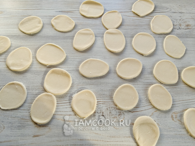 Тесто раскатать потоньше, вырезать круглые лепешки.