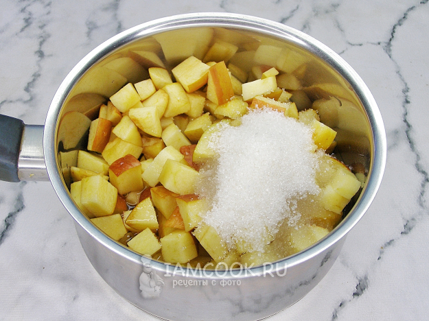 Перекладываем яблоки в сотейник, вливаем воду и кладём сахар.