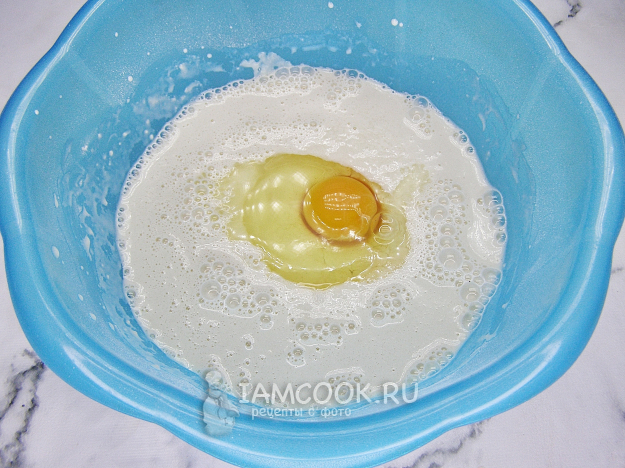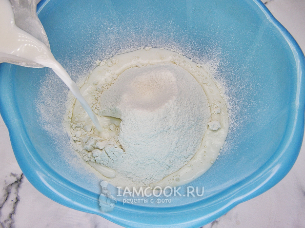 В глубокую миску просеиваем муку. Молоко смешиваем с водой и вливаем в муку, сразу перемешиваем.