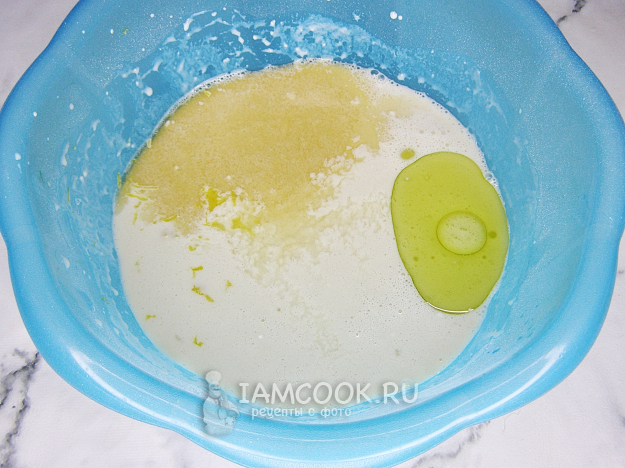 Вливаем бренди, оливковое масло и солим. Добавляем сок и цедру лимона. Ещё раз хорошо перемешиваем, чтобы тесто получилось однородным, и оставляем его на 40-60 минут настаиваться.