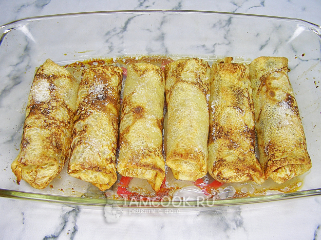 Ставим в прогретую до 180 градусов духовку и запекаем блинчики минут 15, чтобы они ещё больше подрумянились.