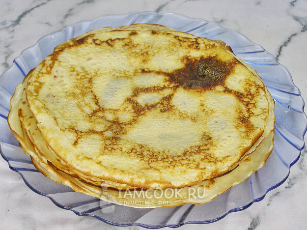 Широкой лопаткой переворачиваем блин на другую сторону и жарим ещё около минуты, до подрумянивания. Таким образом жарим все блины, пока не закончится тесто. Перед тем как налить очередную порцию теста, смазываем сковородку небольшим количеством оливкового масла.